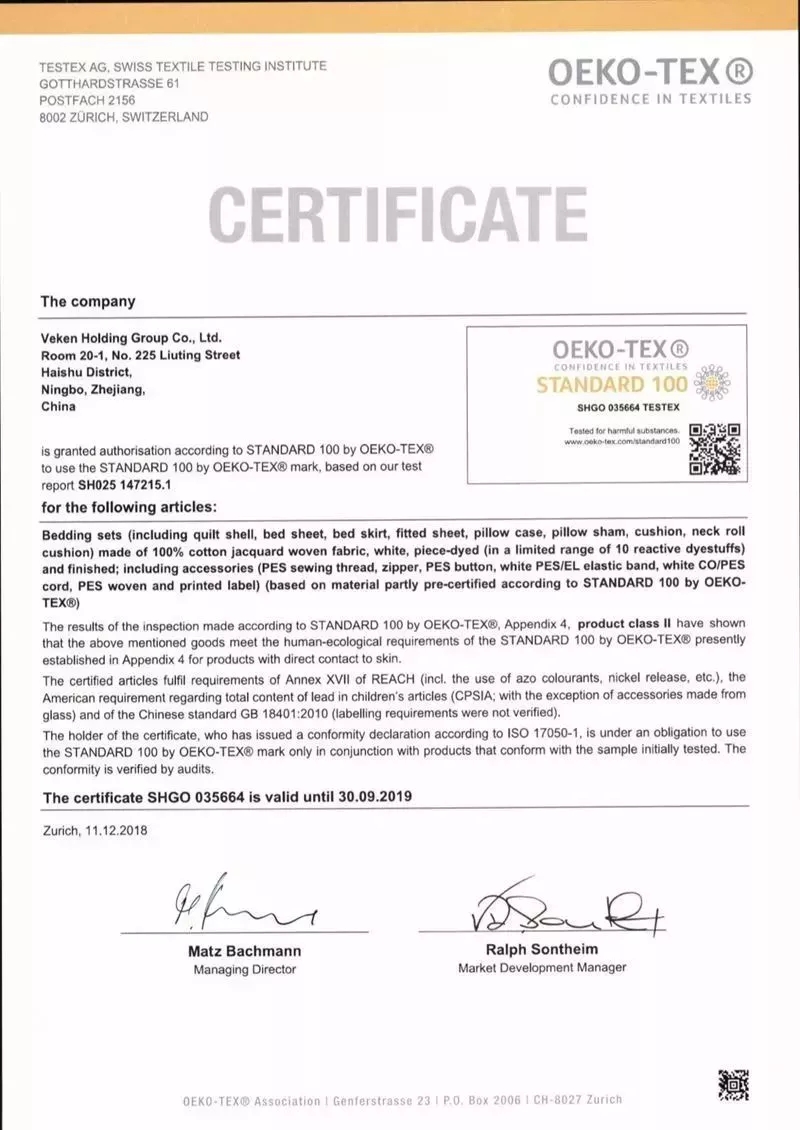 該證書標(biāo)簽適用產(chǎn)品為:床上用品(被套、床單、床圍、靠墊套、護(hù)頸套)由白色、經(jīng)匹染(染料的適用范圍僅限于已申報(bào)的10支活性染料)和后整理的全棉提花梭織面料制成;輔料包括(滌綸縫紉線、拉鏈、滌綸紐扣、白色滌綸/氨綸松緊帶、白色滌棉抽繩、滌綸織標(biāo)和印標(biāo))(部分使用有STANDARD 100 by OEKO-TEX證書的原材料)。